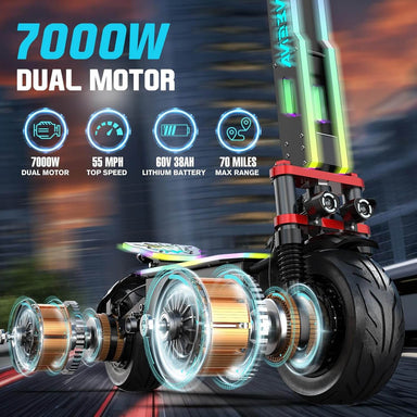 The Joyful Rider GT7 7000W 55mph Dual Motor Folding Electric Scooter is a lightweight, portable, e-scooter that you can take with you anywhere. The...