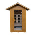 The Burlington outdoor sauna is an ideal size for the back yard.  It includes wide bench seating for maximum comfort, oxygen ionization system for purifying the air, recessed interior lighting, FM radio w/CD and MP3, cup holders, and many more.