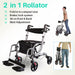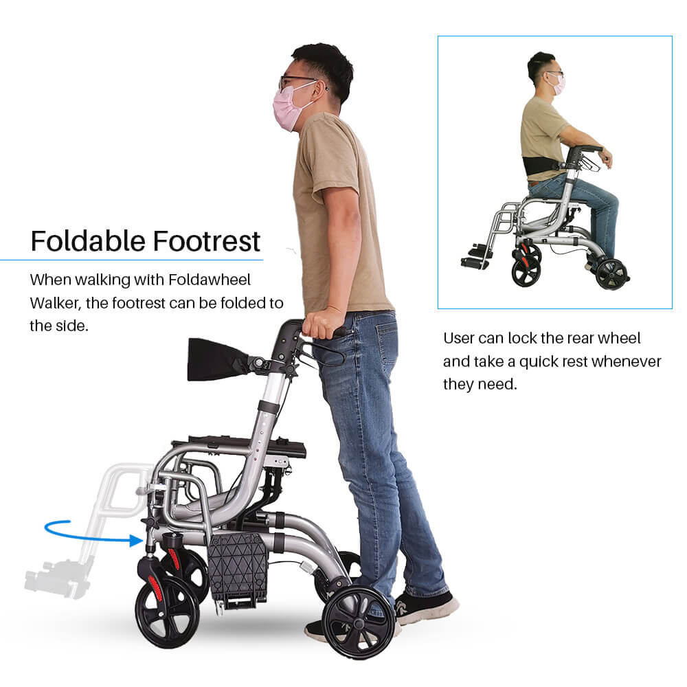 The Foldawheel Walker can be used as a rollator walker or as a transport wheelchair.