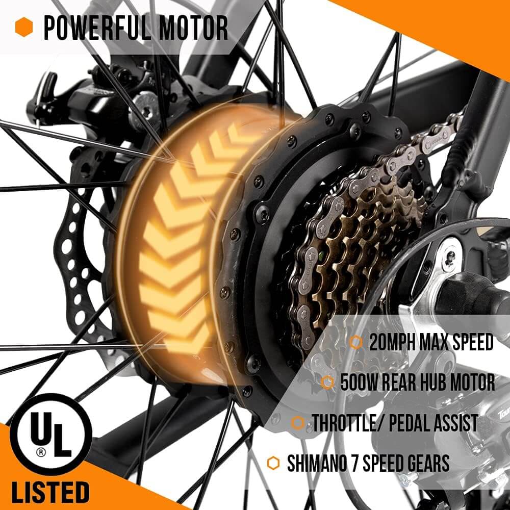 The Ecotric ROCKET UL Certified 500W 36V Fat Tire Electric Bike comes with advanced features such as:  Suspension front fork, higher handle, and 26*4.0 tires.