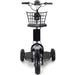 This electric trike features a 16" pneumatic front tire, two 4" pneumatic rear tires and a removable seat.