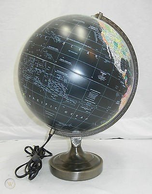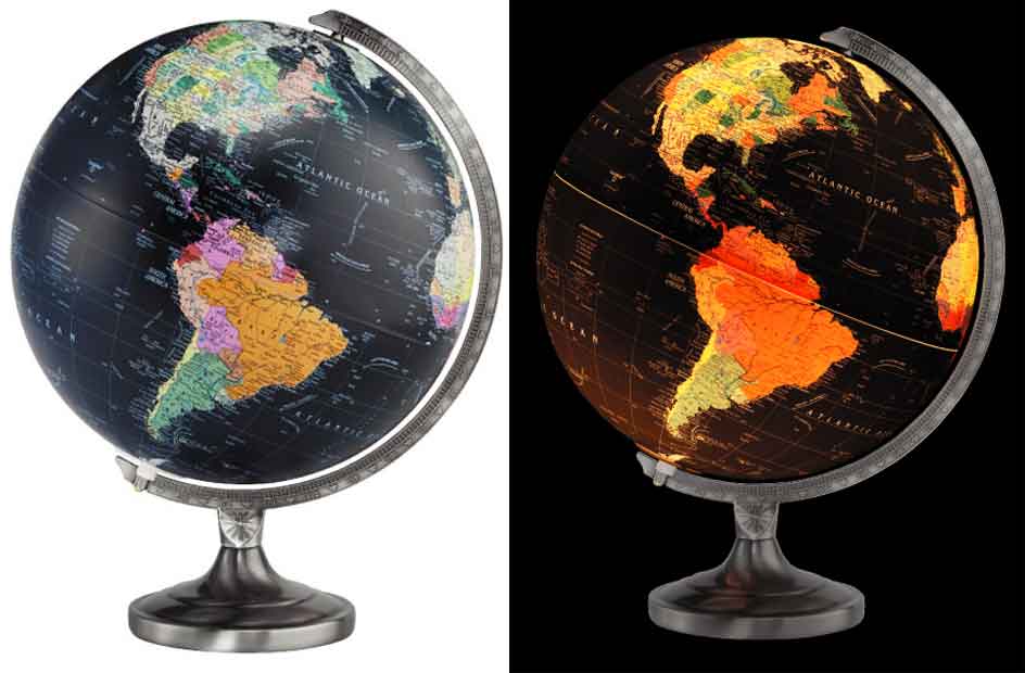 The Replogle OrionĀ desktop globe features a 12" black ocean illuminated globe with political map stylings mounted on a silver finish steel stand with semi-meridian.